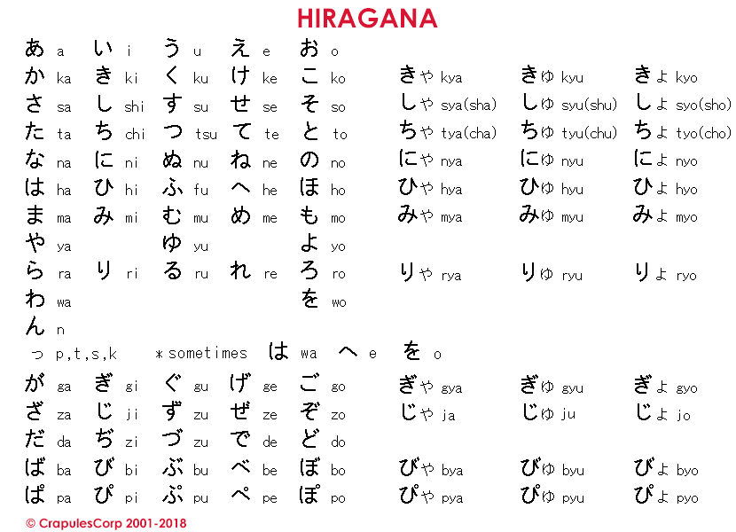 Les Hiragana sont des signes japonais et servent à transcrire les mots japonais. Cet alphabet compte 46 syllabes, ou 96 avec les variantes des 46 premières.Tableau des Hiragana